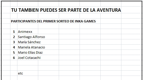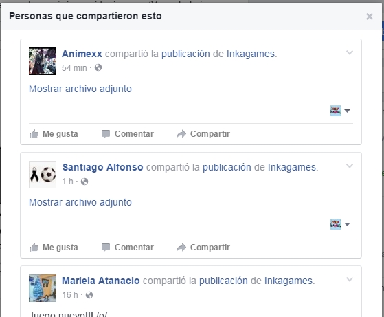 | Luego de haber hecho la publicación del videojuego y en cualquier momento (sin previo aviso), el equipo de Inka Games irá a dicho post y colocará en una lista a todos los que hayan compartido dicho post de manera pública y que el post PUEDA SER VISTO en el perfil del fan de manera pública. |